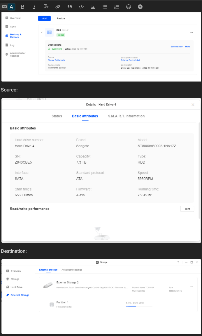 I made a job to backup 1,5 tb data to usb. It takes almost 2 weeks to make the backup. I know i dont have any disk problems. Is there any fix for this ? The app is not usefull if it will take that time. I have been using lots of qnap and synologys with same function and that take perhaps 2 hours or something like that. I have tried ext4 and ntfs but no difference. Any tips for me ?