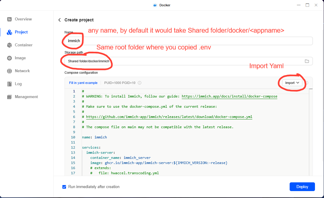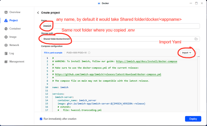 Give it a name, specify the location as /docker/immich ( it will take the .env file from there), import the .yml file we downloaded earlier and hit deploy. You can see the progress of your application and once its running, you can access your immich installation at :2283